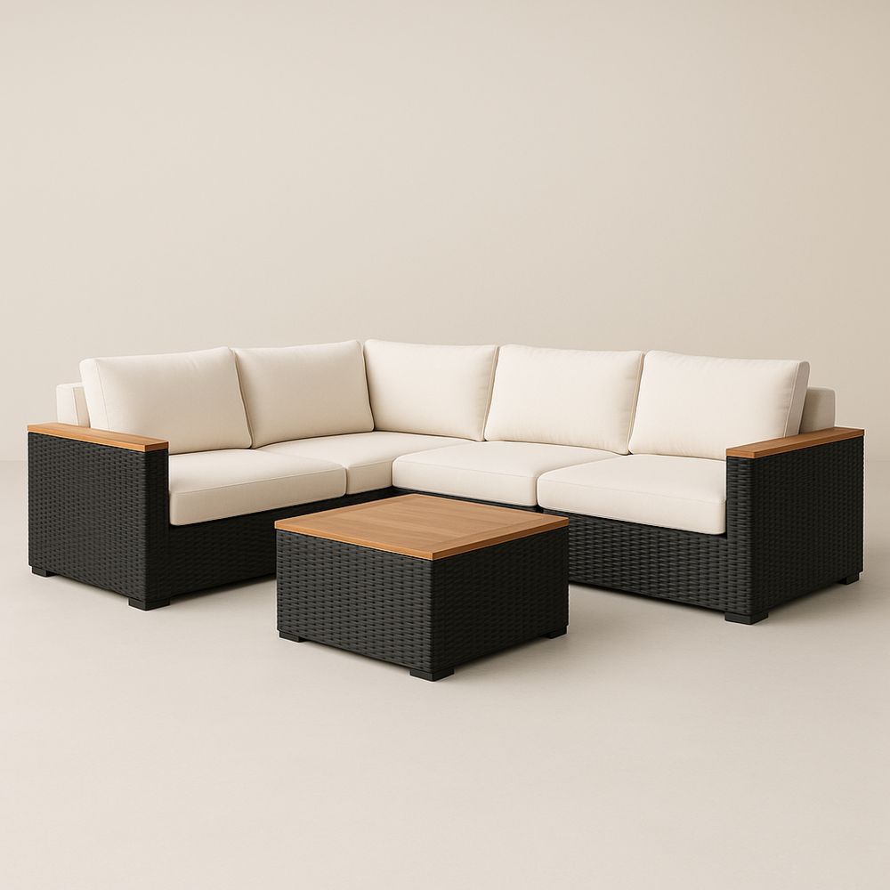 Kültéri L alakú fonott polyrattan kanapészett asztallal, krémszínű párnákkal